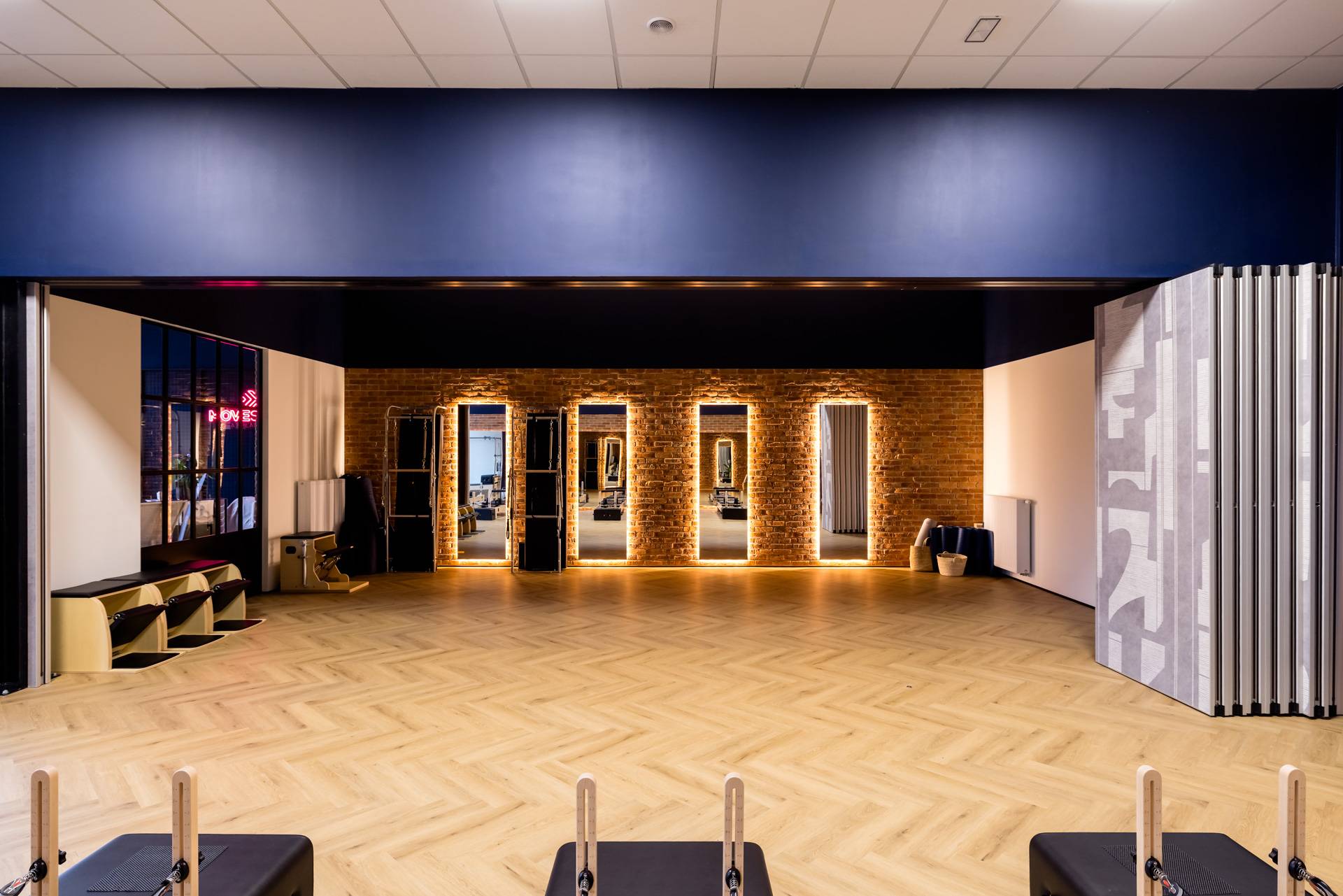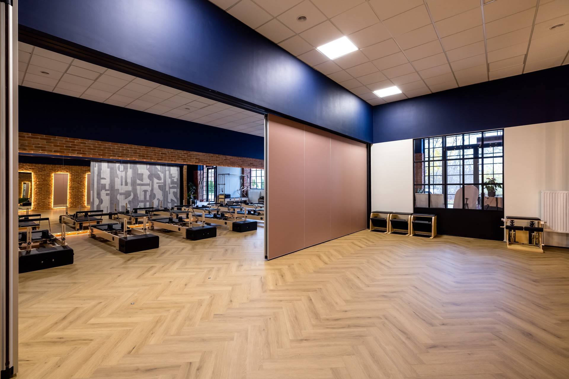 - Zaprojektowana ściana umożliwia podzielenie dużej powierzchni studia na dwie mniejsze sale, gdzie niezależnie mogą się odbywać zajęcia z muzyką