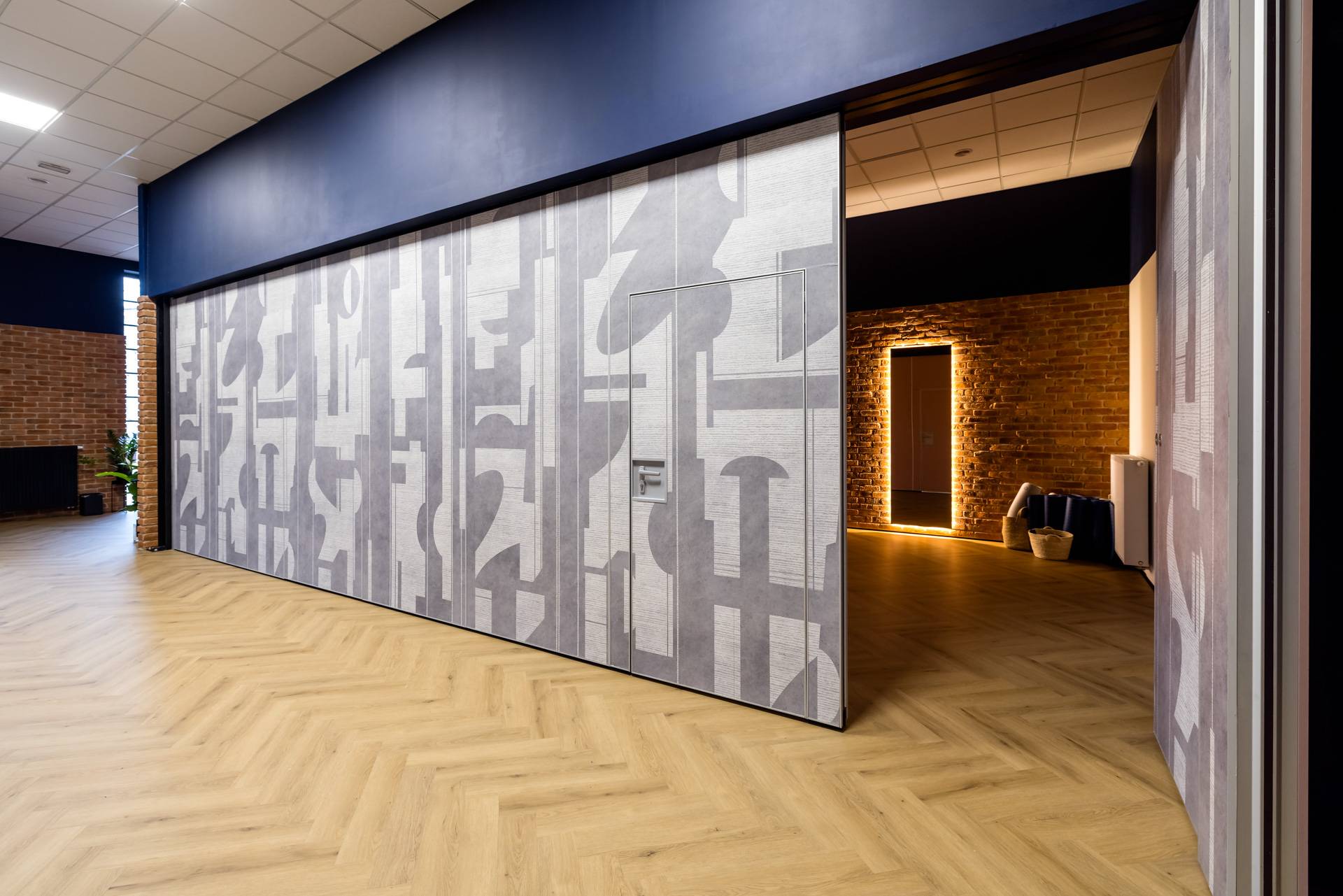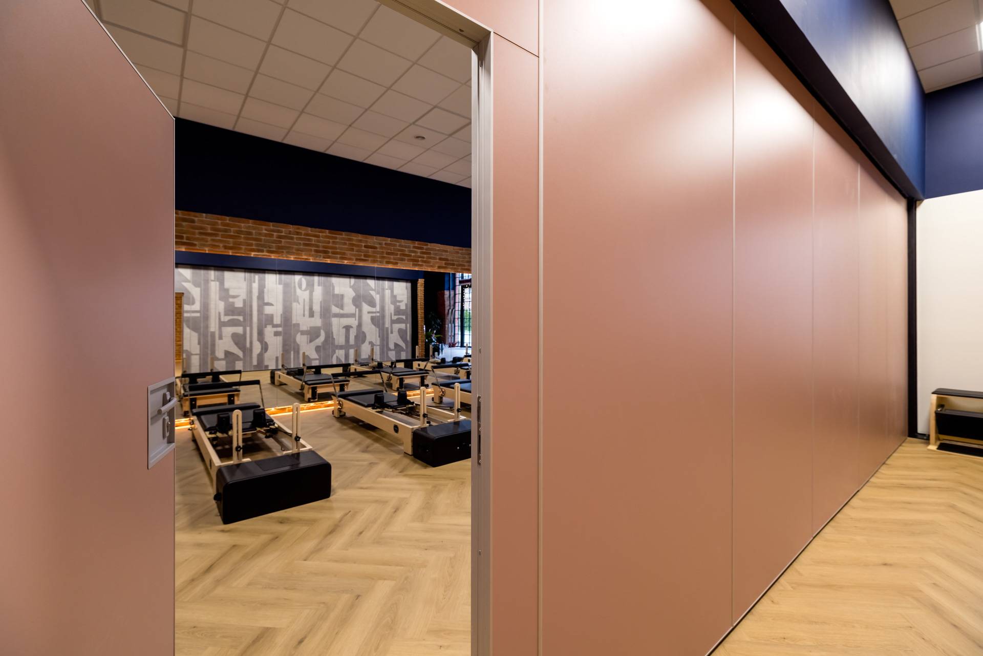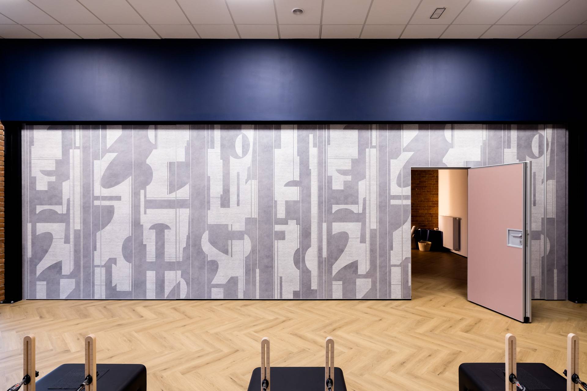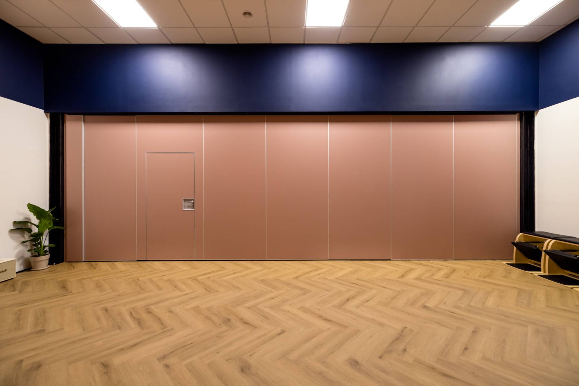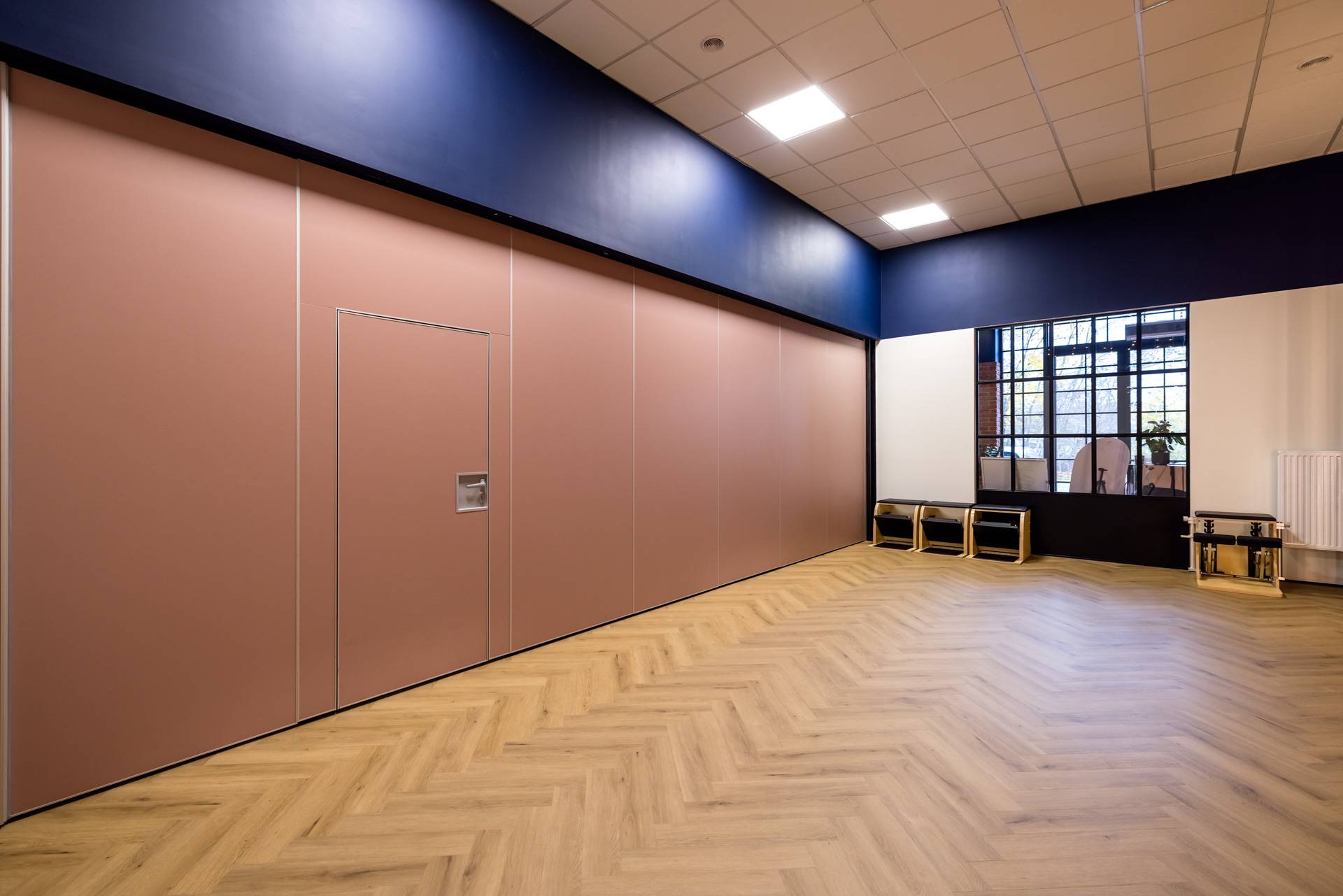 - Ściana przesuwna MAW 110.1 o dźwiękoszczelności ITB 48dB, mocowana do stalowej podkonstrukcji. Obsługa manualna. Połączenie płyty z laminatem HPL w kolorze pudrowego różu oraz tapety laminowanej, która nadaje wnętrzu charakteru i energii.