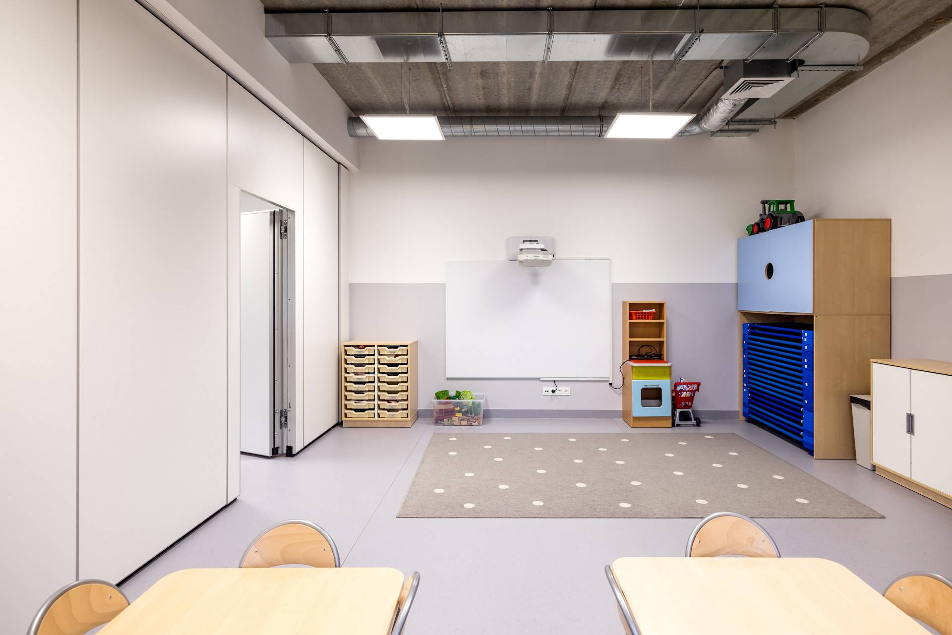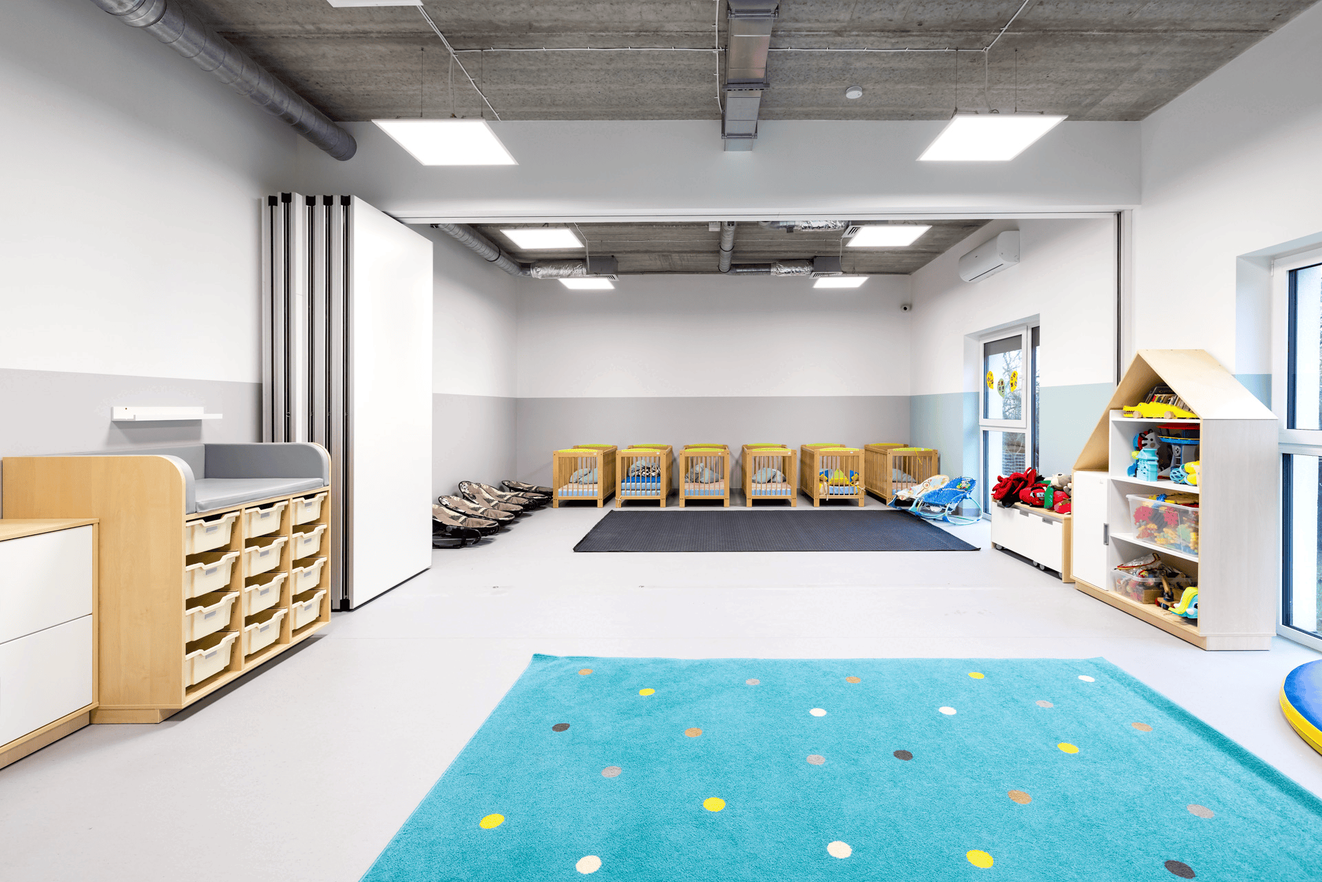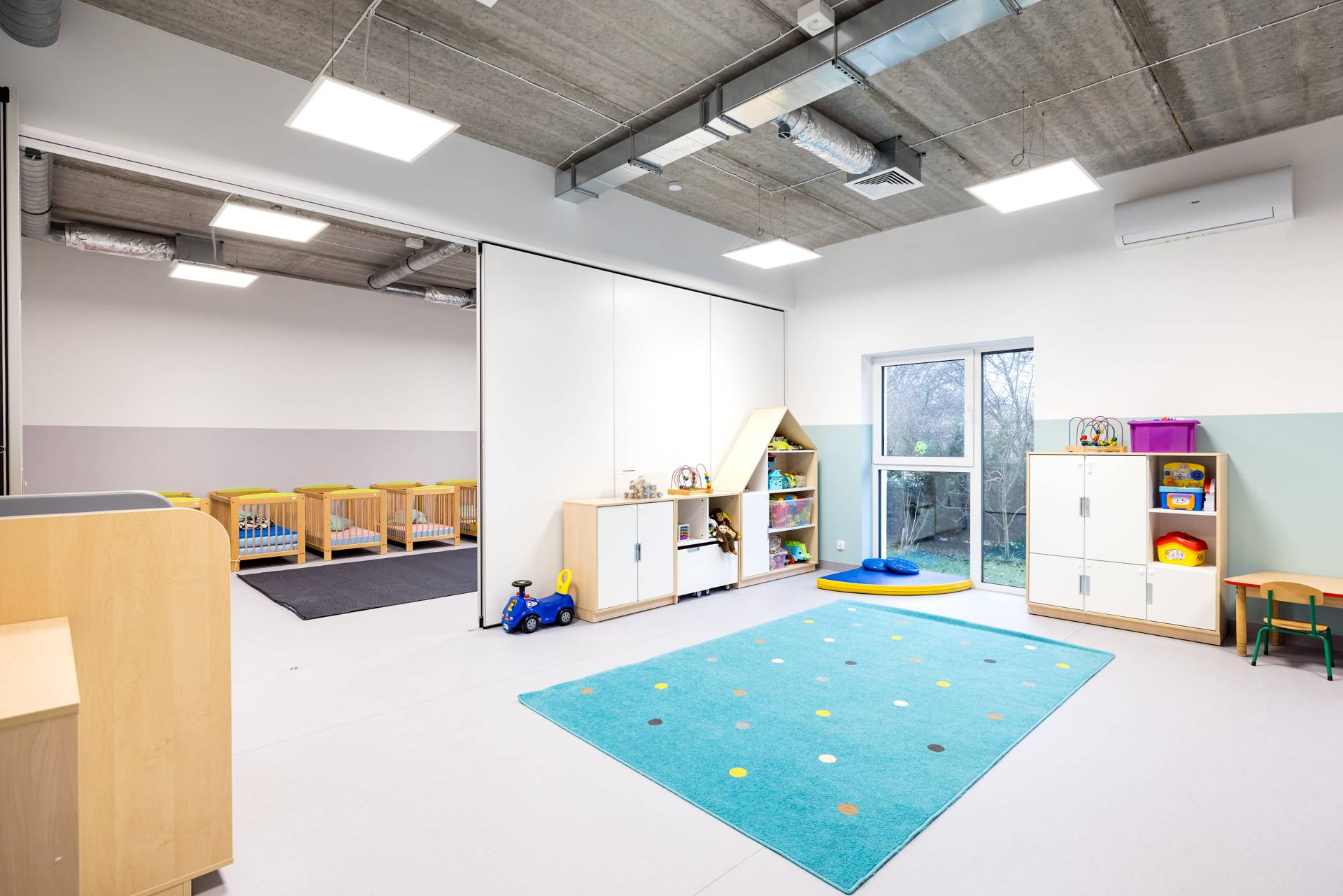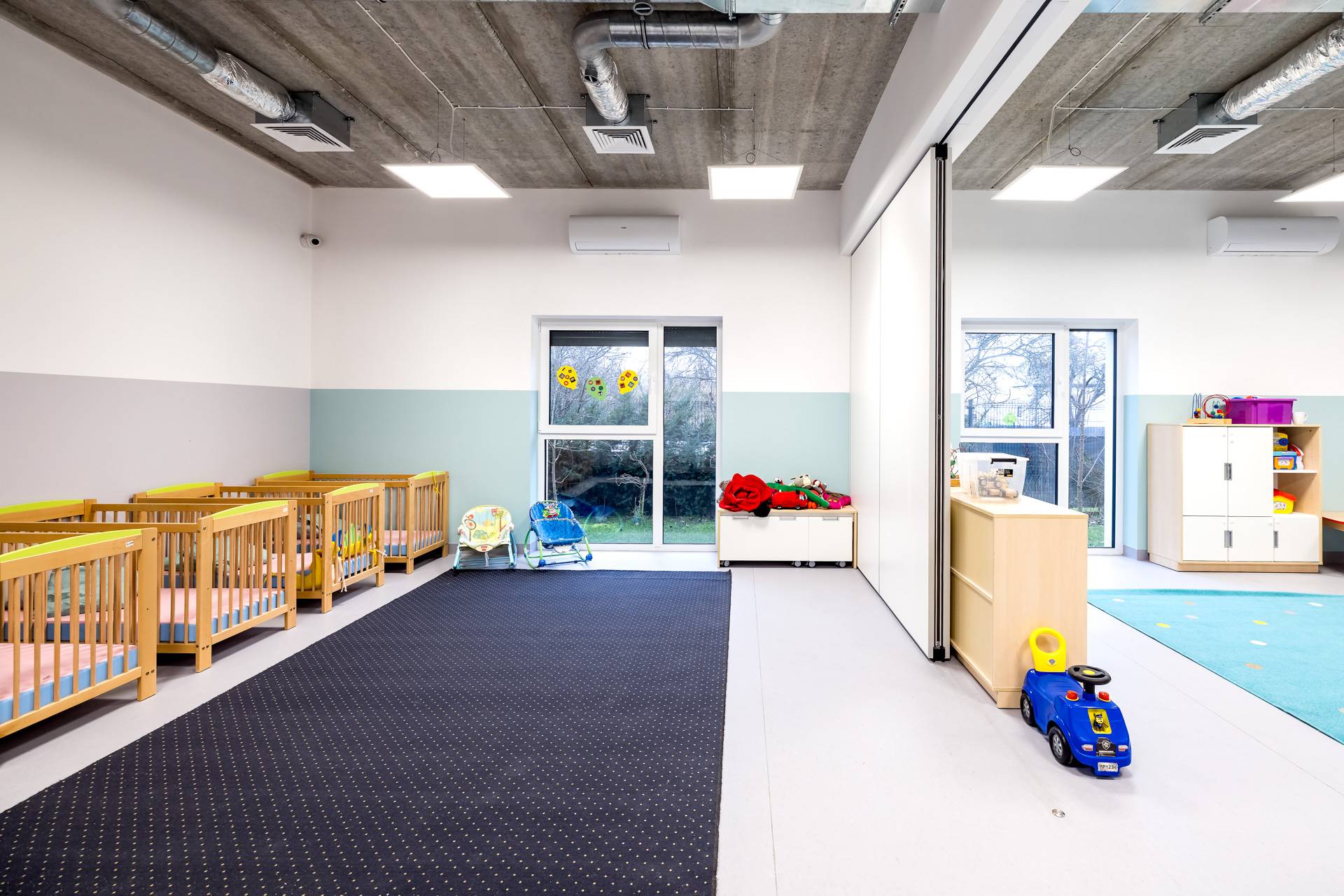 - Ściany mobile zostały zastosowane w dwóch pomieszczeniach przedszkola, aby umożliwić codzienne wydzielanie powierzchni do odpoczynku dla części dzieci.