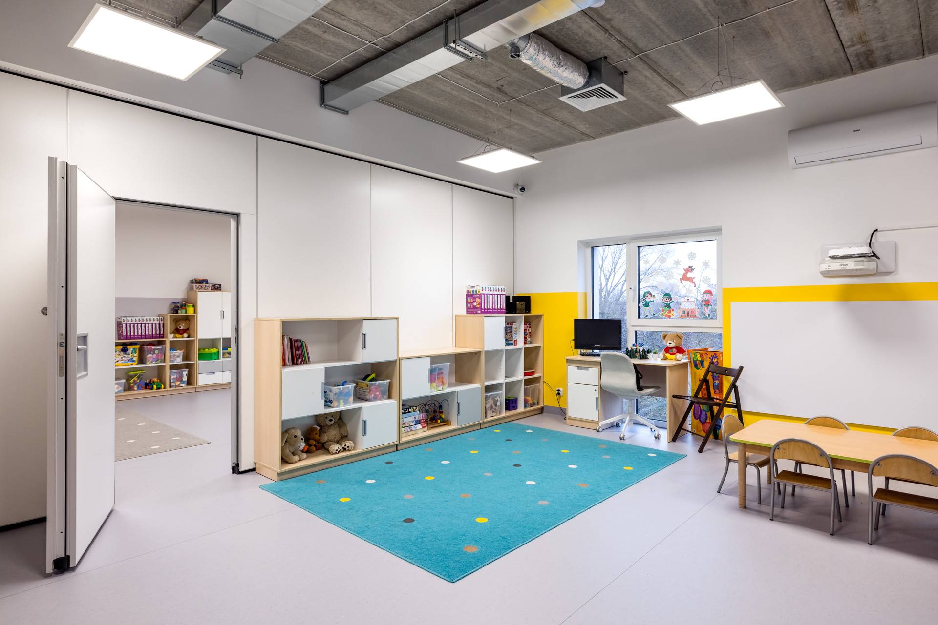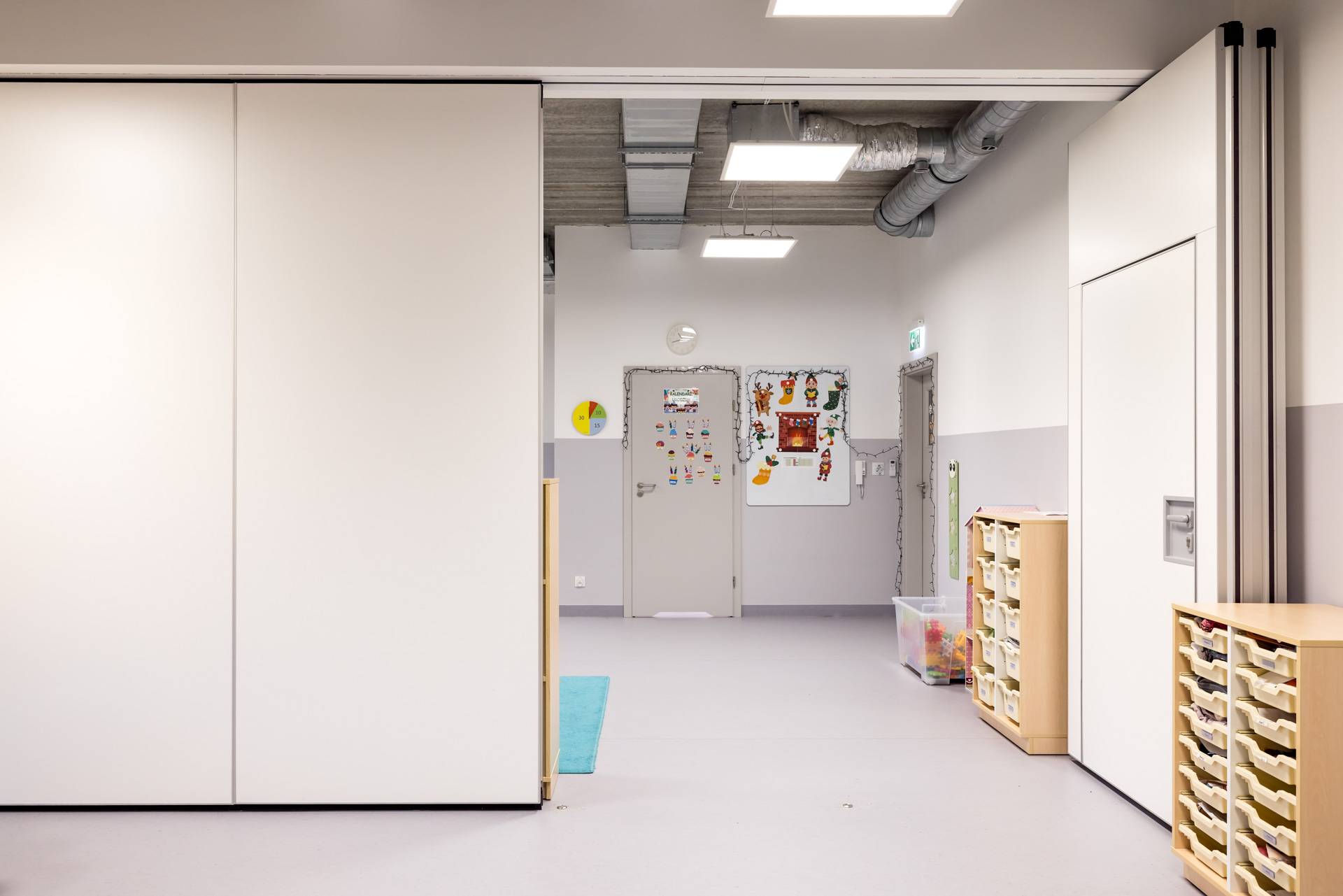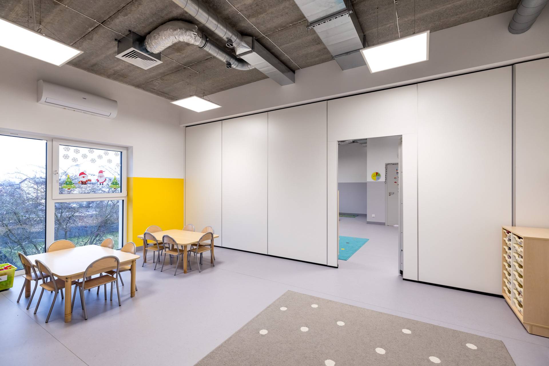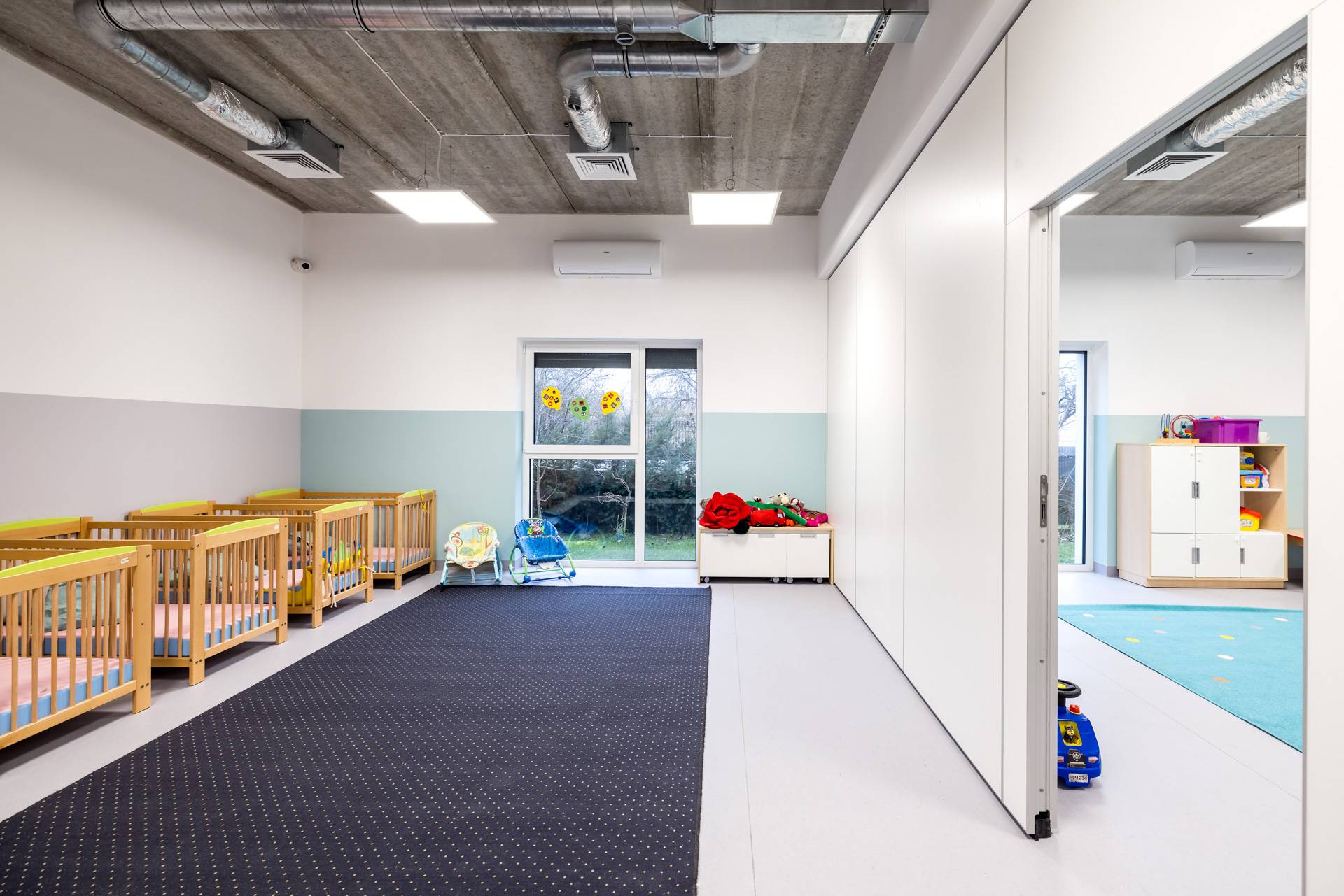 - Ściany mobile zostały zastosowane w dwóch pomieszczeniach przedszkola, aby umożliwić codzienne wydzielanie powierzchni do odpoczynku dla części dzieci.